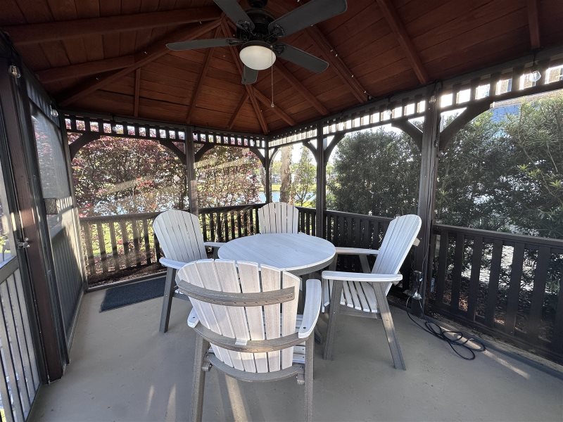 Enjoy your stay at 832 Carrozza Lane, located in the heart of beautiful Bella Terra. This Southeast-facing lot provides a tranquil setting for your stay in coastal Alabama, offering a screened-in gazebo with plenty of space. The gazebo includes a ceiling fan, a table and four chairs, and is perfect for relaxing and enjoying a meal in the shade and breeze.